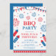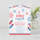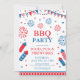 convite de festa de churrasco festivo do dia 4 de julho com quadro de moldura, bandeiras e fogos de artifício isolado no fundo branco. Design para convites do Dia da Independência Americana. Tipografia personalizável em vermelho e azul.