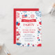 quadro de moldura para churrasco de festival de 4 de julho com bandeiras, grelhas, fogos de artifício, balões, comida e bebidas. Isolado em fundo branco. Design para convites do Dia da Independência Americana. Tipografia personalizável em vermelho e azul.