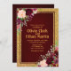 Um convite luxuoso que apresenta os seus pormenores sobre o rico burgundy rodeado por uma estrutura de brilho dourado com polos de rosa nos tons quentes de marsala, rosa e azul. A placa se reverte para um buquê pequeno no centro.