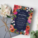 Convite de casamento Floral com flores desenhadas à mão em lindas combinações de cores — verde-oliva com cor laranja e rosa quente e coral e azul-marinho — formando um quadro em torno do seu convite em fontes brancas. A parte traseira apresenta uma textura de pássaro impressa.
