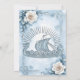 Quadro Floral com Rosa e Design Celta. A imagem apresenta um delicado quadro floral com uma estética suave e sonhadora. As rosas brancas com sutis centros beges e folhas azul-esverdeadas enfeitam os cantos superior esquerdo e inferior direito. A estrutura em si é construída a partir de um design azul-gelo, inspirado por Celta. Um padrão de nó Celta esmaecido e circular é visível no fundo.