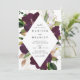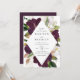 Convites florais elegantes com detalhes de seu casamento cercados por um quadro geométrico de ameixa escura e flores brancas de aquarela, acentuados por folhas falsas de ouro rosa e folhas verdes. O convite reverte para um fundo sólido e escuro de cor de ameixa. Projetado para coordenar com a nossa coleção de casamento Dark Plum Floral.