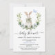 Quaint Blue Green Boys Little Bunny Chá de fraldas Convite para o chá de fraldas de um lindo coelho com um coelho branco, uma grande gravata de arco verde e uma coroa azul floral e verde. Este doce convite para o chá de fraldas do coelho para um bebê também apresenta um título de caligrafia moderna e borboleta azul.