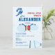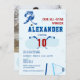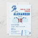 Este convite de aniversário branco, azul e vermelho, com tema de hóquei, apresenta um jogador de hóquei, paus e um objetivo. Personalize facilmente o texto e a foto para criar um convite exclusivo para o seu evento. Para itens coordenados, por favor verifique minha Coleção de Hóquei.