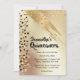 Um fundo de folha de alumínio luxuoso, superficial e na moda falso tem pontos de bolinhas chita irregulares em um ouro e preto. Um bruxamento metálico com aspecto dourado com flocos de confete sobre ele tem bordas ásperas e aparece no canto superior esquerdo a um ângulo apontando para baixo. A carta negra da caligrafia decorativa tem o nome das meninas de aniversário e a ocasião como um título. Abaixo estão modelos para detalhes do local e informações relacionadas à sua festa de aniversário. Ideal para qualquer idade, festas de qualquer ano ou para eventos e reuniões formais.