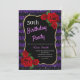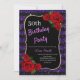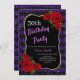 Púrpura elegante, riscas negras brilhando e convite de aniversário de rosas vermelhas para mulheres de qualquer idade. A idade pode ser alterada para qualquer idade. O texto pode ser alterado para qualquer coisa para ajustado do seu evento. Fontes, cor da fonte e texto são completamente personalizáveis! A forma e o tipo do papel podem ser personalizados para ajustado do seu orçamento e sabor!