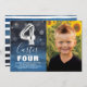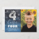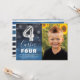 Quarto convite de aniversário moderno para a criança, desenhado com uma foto do aniversariante, um fundo azul-impermeável, confete-bolha transparente, e um grande balão de hélio número quatro. O nome da criança está escrito em texto branco em grande caligrafia com um simples modelo de aniversário por baixo que é fácil de personalizar.