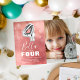 Quarto convite de aniversário moderno para a sua criança, desenhado com uma foto do aniversariante/menina, um fundo cor-de-água cor rosa, confete de bolhas transparente e um grande balão de hélio número quatro. O nome da criança está escrito em texto branco em grande caligrafia com um simples modelo de aniversário por baixo que é fácil de personalizar.