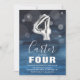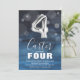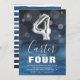 Quarto convite de aniversário moderno para a criança, desenhada com um fundo azul de cor-d-água, confete de bolha transparente e um balão grande de hélio número quatro. O nome da criança está escrito em texto branco em grande caligrafia com um simples modelo de aniversário por baixo que é fácil de personalizar.
