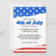 Este convite de festa personalizado apresenta um tema patriótico do Quatro de Julho. As bordas superior e inferior apresentam o padrão da bandeira americana. Uma faixa de estrelas brancas sobre um fundo azul brilhante é colocada ao longo da parte superior. Uma faixa de listras brancas e vermelhas brilhantes é colocada ao longo da parte inferior. O título da festa "4 de Julho" é impresso no centro em uma fonte azul grande, seguido pelas informações do evento.
