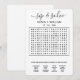 Convite de Casamento de Sip e Busca | Design de Quebra-cabeça de Pesquisa Personalizada do Word Torne o seu convite inesquecível com o nosso Convite de Sip e Busca no Casamento | Design de Quebra-cabeça de Busca de Palavras Personalizada — uma reviravolta divertida e interativa em artigos de papelaria de casamento tradicionais. Projetado para entreter e engajar, este quebra-cabeça de busca personalizada de palavras permite que seus convidados celebrem sua história de amor enquanto descobrem os detalhes do seu grande dia. Ideal para chás de panela, festas de noivado, casamentos não-tradicionais ou casais divertidos, este convite combina pistas personalizadas, palavras ocultas e design moderno elegante para criar uma experiência que seus hóspedes realmente gostarão de ler. É perfeito para adicionar um toque pessoal único ao seu papel de carta enquanto define um tom alegre e alegre. Personalize com seus nomes, data de casamento, local e uma lista personalizada de palavras, como locais, datas, apelidos ou piadas de dentro. Cada quebra-cabeça é completamente único e pode até ser combinado com um código QR que liga ao seu site de casamento ou ao formulário de RSVP online. Impresso no estoque de papelão premium e disponível em várias cores, incluindo tons negros e brancos, neutros e paletas com tema de casamento, este convite ajustado lindamente em qualquer suíte de casamento moderno, minimalista ou criativo. Quer tenham colocado dentro num envelope formal ou sejam entregues num evento ocasional, os vossos convidados adorarão resolver o quebra-cabeça enquanto beberam e aprendem mais sobre a vossa viagem como casal. 🖤 Clique em Personalizar Agora para criar seu convite para Quebra-cabeça de Palavras Sip e Busca no Word e adicionar um toque de diversão para sempre. convite para pesquisa de palavras de casamento, convite de casamento personalizado, convite para apresentação e pesquisa, convite para jogos de chá de panela, design de convite para casamento divertido, cartão de quebra-cabeça de casamento personalizado, pesquisa de palavras negras e brancas, inserção de rsvp de casamento interativo, lista de casamento de quebra-cabeça moderna, convite para pesquisa personalizada