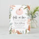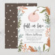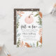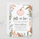 Cartão de convite para chás de fraldas de trigo mourisco e rústico com ilustração de uma abóbora rosa com folhas de outono e verde à volta do cartão. O texto diz "apaixonar-se pelo bebê XX." Perfeito para o chá de uma garota no dia de Ação de Graças.