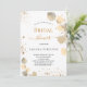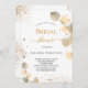 Um fundo branco decorado com ouro eucalipto e poeira falsa dourada. Personalize e o nome da noiva a ser e os detalhes da festa. Letras pretas e ouros coloridas. Traseira: fundo branco com poeira brilhante ouro.