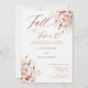 Um modelo de convite romântico, elegante, clássico e moderno para festa de noivado nos meses de outono - setembro, outubro, novembro. Apresenta caligrafia moderna e elegante e o título "apaixonar-se" e um arranjo floral rústico de folhas de outono e rosas com uma matiz laranja queimada, terracota. Luxuoso, mas simples, clássico, mas chique, moderno, mas eterno. Uma escolha encantadora para uma festa de noivado de outono com cobre, laranja queimada, terracota, bege, vermelho, laranja e outras matizes de queda.