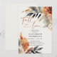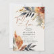 Um chá de panela romântico, elegante, clássico e moderno para os meses de outono - setembro, outubro, novembro. Apresenta caligrafia moderna e elegante e o título "apaixonar-se" e um arranjo botânico rústico das folhas de outono com um esquema de terracota, laranja queimada e cor azul. Luxuoso, mas simples, clássico, mas chique, moderno, mas eterno. Uma escolha encantadora para uma festa de noivado de outono com cobre, laranja queimada, terracota, bege, vermelho, laranja e outras matizes de queda.