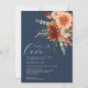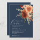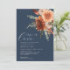 Defina o tom para o seu chá de panela de outono inspirado no seu livro com este bonito convite com um buquê floral de cor d'água em tons de ferrugem e terracota. Personalize com todos os detalhes importantes como nome da noiva, data do chá, local, RSVP e informações do registro. O reverso é coordenado em azul escuro