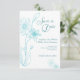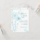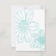 Quadrado contemporâneo moderno com esboço floral caprichoso em azul água sobre branco com letras em verde-teal da Budget Bridal. Flor desenhada com haste única com lírio e folhas, com flores adicionais desenhadas à mão no verso. Convites personalizados customizados de baixo custo, acessíveis e econômicos para o seu dia especial de casamento sem sacrificar a qualidade ou parecer barato. Seja ousado! Divirta-se! Seja feliz! Economize dinheiro!