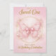 Celebre o dia especial da sua pequena princesa com este elegante convite de 1º aniversário Sweet One Pink Butterfly! Com um fundo pastel suave em tons de rosa, uma delicada borboleta rosa, laço de cetim rosa, moldura fina dourada e detalhes sutis com brilho de pérola, este convite exala uma estética premium e sofisticada perfeita para o primeiro aniversário da sua bebê.
