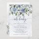 Estes adoráveis convites para o chá de bebê apresentam um bonito buquê de flores azuis poeirentas, elegante tipografia moderna de roteiro que diz "oh baby", e uma lavagem de aquarela azul na moda. Um belo olhar floral para chá da futura mãe!