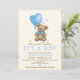 Querida, é um menino! O tema do ursinho de pelúcia bonitinho convida para um bebê. Urso de pelúcia com um arco azul com corações azuis e balão azul com todo o texto personalizado para a celebração do seu chá
