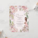 Um belo e elegante convite de aniversário da Quinceañera em tons cor-de-rosa. Este belo convite apresenta uma moça glamourosa e elegante num vestido floral cor-de-rosa embelezado com sotaques dourados, uma bolsa de ouro brilhante e joias douradas. Há um quadro floral coordenado no topo, tudo sobre um fundo rosa esbranquiçado. "Quinceañera" está escrito em uma tipografia moderna, escrita à mão. Copyright Elegant Invites, todos os direitos reservados.
