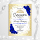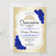 Dourado convite para comemoração da Quinceanera branca e negra. Apresenta fontes de script, rosas azuis reais, tiara e confetti. Design azul de safira clássica com ouro brilhante falso. Perfeito para uma elegante celebração de glam.