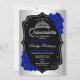 Convite para comemoração da Quinceanera, azul-real, prata. Apresenta fontes de script, rosas azuis reais, tiara e confetti. Design azul de safira clássica com prata brilhante falso. Perfeito para uma elegante celebração de glam.