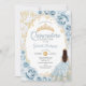 O convite para comemoração da Quinceanera, azul-bebê e ouro. Apresenta uma garota morena em vestidos de capa de bola, fonte de script, borboletas de ouro, rosas de aquarela e tiara. Perfeito para uma elegante celebração de glam estilo princesa. Personalize com seus próprios detalhes. Impressos convites Zazzle ou modelo de impressão digital instantânea para download.