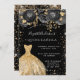 Um convite moderno, na moda e glamouroso para uma Quinceañera, festa de aniversário 15. Um fundo preto com pó de ouro falso, um vestido e rosas de ouro e preto, florais. O nome é escrito com um moderno estilo escrito à mão. Personalize e adicione os detalhes da sua festa.