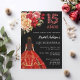 Um convite moderno, na moda e glamouroso para uma Quinceañera, festa de aniversário 15. Um fundo preto, uma garota vestindo um vestido vermelho e dourado e rosas vermelhos, cor-de-rosa e ouro, florais. O nome é escrito com um moderno estilo escrito à mão. Personalize e adicione os detalhes da sua festa.