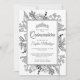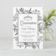 Um convite de festas botânico floral de Quinceanera preto e branco com tiara. Personalize com seu nome nesta assinatura de script contrastada com a tipografia de texto serif clássica e resistente. Floral na parte de trás do convite.