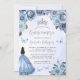Este adorável convite da quinceañera mostra uma fronteira de rosas azuis com folhagem cintilante prateada em fundo azul de aquarela. Uma tiara prateada, uma menina de cabelo escuro em um vestido de princesa azul e pequenas borboletas azuis decoram o texto. A palavra "Quinceañera" e o nome do convidado de honra aparecem no guião da cinza de prata, com o texto remanescente na cinza de carvão e serifa.