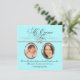 Lindo foto de bebê e atual foto de prata e azul lacrimejante Convite Quinceanera. Este doce, então, e agora azul, foto teal convite Quinceanera apresenta uma fita prateada elegante e arco com quadros ovais prateados para duas fotos - uma como bebê e a outra corrente. Personalize este elegante convite para a Quinceanera, em prata e azul lacrimogêneo, adicionando fotos, detalhes do evento, estilo da fonte, tamanho da fonte e cor e texto.
