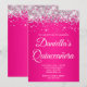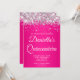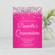 Crie seu próprio convite para comemoração de 15 de na moda para sua filha. Gráficos cintilantes prateados decorativos formam uma borda superior. A arte digital em segundo plano apresenta uma vívida pastilha elástica com gradiente rosa quente. Personalize a cor do texto branco do convite ou os estilos de fonte. O texto "Quinceañera" também é personalizável. Os brilhos e a brilha do luxo serão criados por elementos artísticos que impressão gostam de uma foto.