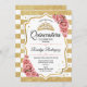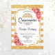 Dourado convite para comemoração da Quinceanera branca. Apresenta faixas, fontes de script, rosas rosa-pinceladas, tiara e confetti. Design cor-de-rosa com prego com ouro brilhante. Perfeito para uma elegante celebração de glam.