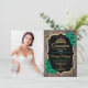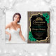 Convite de festas Rustic Quinceanera com sua foto. Na moda em verde esmeralda, ouro e preto. Apresenta o padrão rústico de celeiro de madeira, fonte de script, rosas, tiara e confetti. Perfeito para uma comemoração de 15 de aniversário do estilo clássico da princesa do glam. Impressos convites Zazzle ou modelo de impressão digital instantânea para download.