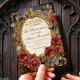 Inspirado en castillos antiguos y en la fantasía oscura, este diseño presenta un lujoso marco barroco dorado que contrasta dramáticamente con la acuarela de rosas carmesí sobre un fondo sombrío y distinguido.