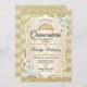 Dourado convite para comemoração da Quinceanera branca. Apresenta faixas, fontes de script, rosas brancas, tiara e confetti. Design clássico com ouro falso brilhante. Perfeito para uma elegante celebração de glam.