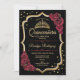 Convite de aniversário de Quinceanera. Burgundy elegante, design preto branco com ouro brilhante falso e diamantes tiara. Apresenta faixas brancas pretas e rosas vermelhas. Perfeito para uma festa de aniversário na moda. Impressos convites Zazzle ou modelo de impressão digital instantânea para download.