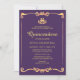 Convite Clássico Quinceañera. Com fontes de script, tiara, design de cor roxa e dourada.