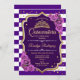 Convite para comemoração da Quinceanera de ouro roxo. Apresenta faixas, fontes de script, rosas, tiara e confetti. Design roxo clássico com ouro brilhante. Perfeito para uma elegante celebração de glam.