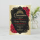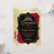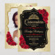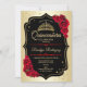 Dourado convite para comemoração do vermelho negro Quinceanera. Apresenta fontes de script, rosa vermelha, tiara e ouro brilhante. Design clássico com foto atrás. Perfeito para uma elegante celebração de glam estilo princesa. Personalize com seus próprios detalhes. Impressos convites Zazzle ou modelo de impressão digital instantânea para download.