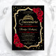 O convite para comemoração do ouro vermelho negro Quinceanera. Apresenta fontes de script, rosa vermelha, tiara e ouro brilhante. O clássico design formal perfeito para uma elegante celebração de glam estilo princesa. Personalize com seus próprios detalhes. Impressos convites Zazzle ou modelo de impressão digital instantânea para download.