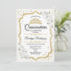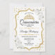 Convite de festas de Quinceanera. Design elegante em branco e ouro. Apresenta fontes de script, rosas brancas, tiara e confetti. Design clássico com folha de ouro falso brilhante. Perfeito para uma comemoração de na moda.
