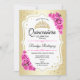 Dourado convite para comemoração da Quinceanera branca e negra. Apresenta fontes de script, rosas cor-de-rosa pastel, tiara e confetti. Design cor-de-rosa pincelada e elegante com ouro brilhante. Perfeito para uma elegante celebração de glam.