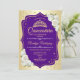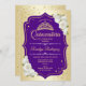 Dourado convite para comemoração da Quinceanera branca negra. Apresenta fontes de script, rosas brancas, tiara e confetti. Design roxo clássico com ouro brilhante. Perfeito para uma elegante celebração de glam.