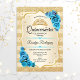 Dourado convite para comemoração de Quinceanera. Apresenta faixas, fontes de script, rosas azuis aqua, tiara e confetti. Design azul de turquesa clássico com ouro brilhante falso. Perfeito para uma elegante celebração de glam.