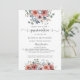 Elegante convite Floral quinceañera, que mostra seus detalhes com belas bordas florais no topo e no fundo, com belas folhas de cor d'água pintadas à mão e flores em branco, pêssego, rosa pincelado, azul empoeirado, azul e tons de sábio. O mesmo convite está também disponível em espanhol. Uso de detalhes da caligrafia. Traseira de cartão com um tom azul elegante e empoeirado com duas listras cor-de-rosa. Parte da nossa coleção de casamento e eventos "Feliz Floral".