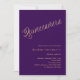 Um convite da Quinceañera moderna. Um fundo roxo e a palavra Quinceañera escrita com letras grandes. Personalize e adicione um nome e detalhes da parte.