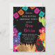 Design apresenta um elemento floral colorido impresso em tons de laranja, cor-de-rosa, verde, púrpura e verde de flores aquáticas sobre fundo negro com papel picado, cacto, coroa ouro com rubis vermelhos e uma menina de vestido vermelho. Caligrafia ou escrevendo de tipo.